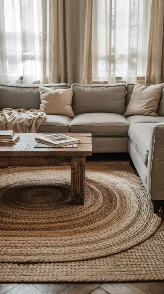 The foundation of any great earthy living room starts from the ground up. Natural fiber rugs—jute, sisal, seagrass, or wool—instantly ground your space while adding crucial texture and warmth underfoot.