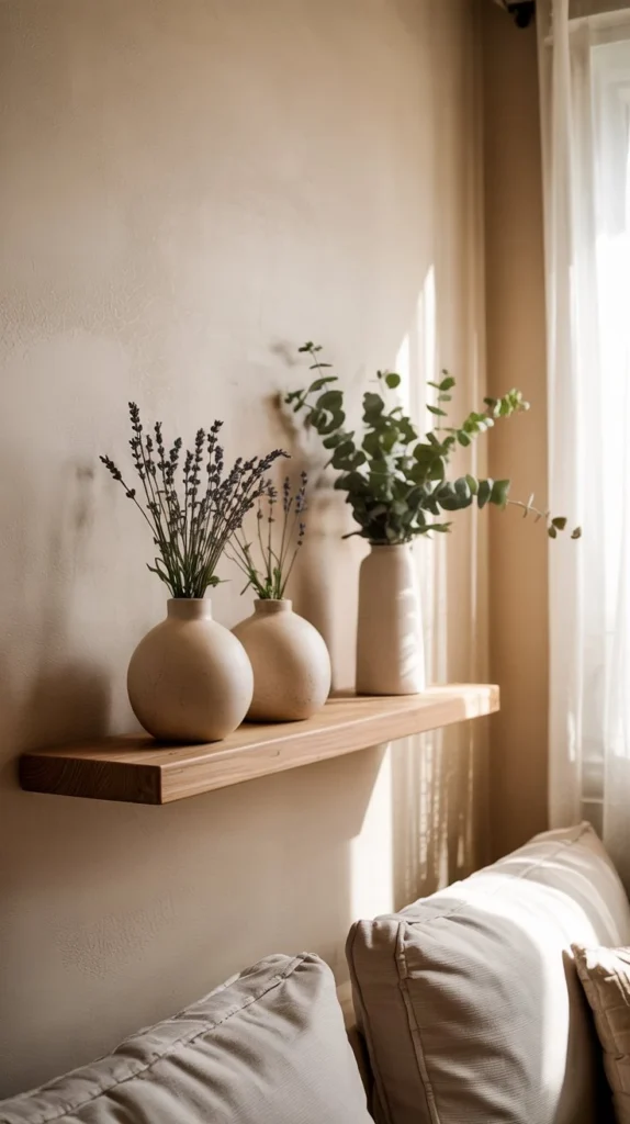 Choose decor items made from natural materials: wooden beads in a bowl, a collection of stones or driftwood, woven baskets of varying sizes, ceramic vessels in muted glazes. These pieces should feel like treasures you’ve collected rather than items purchased in a single shopping trip.