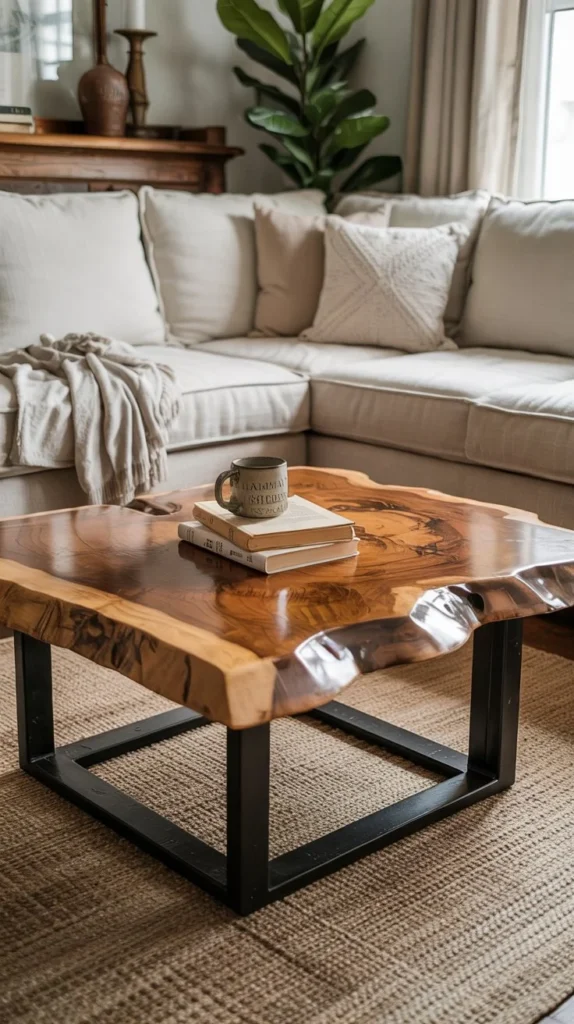 Nothing anchors an earthy living room quite like substantial wood furniture. We’re talking live-edge coffee tables, chunky reclaimed wood media consoles, and rustic wooden benches that look like they’ve lived a thousand lives.