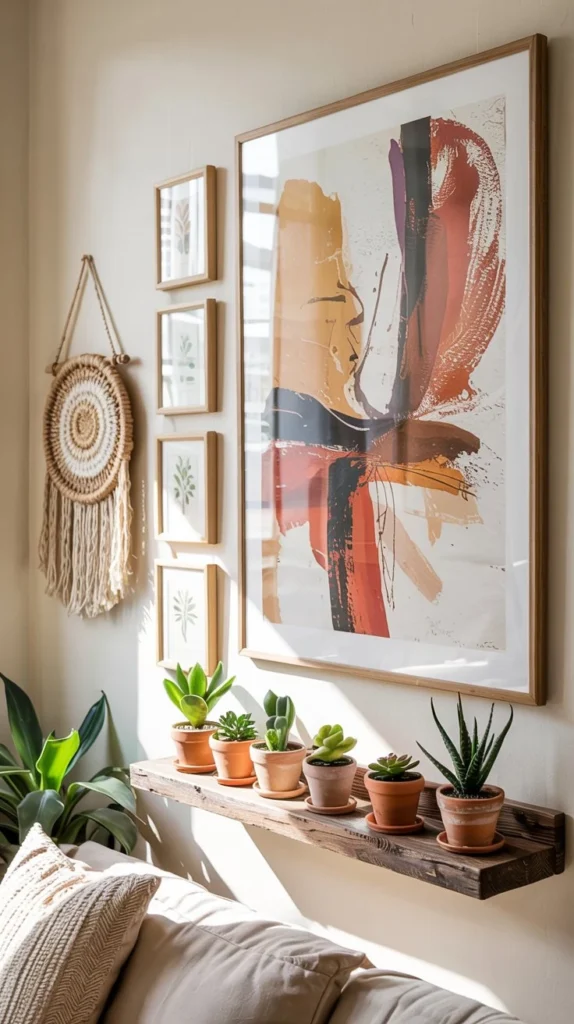The magic happens when you mix mediums. Combine a large-scale abstract piece in earthy tones with smaller framed vintage botanicals and a woven wall hanging. Add a natural wood floating shelf to display ceramic pieces or small potted plants, turning your gallery wall into a three-dimensional experience.