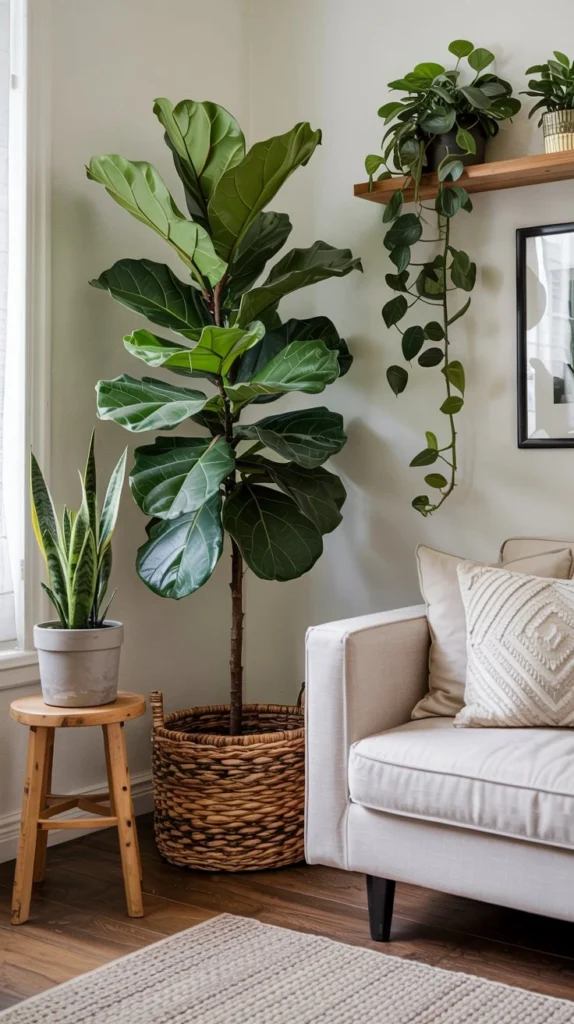 Choose pots that align with your aesthetic: terracotta, ceramic in muted glazes, woven baskets, or simple concrete planters. Group plants in odd numbers and vary their heights for visual interest. A tall floor plant paired with medium tabletop greenery and trailing shelf plants creates that lush, layered look.