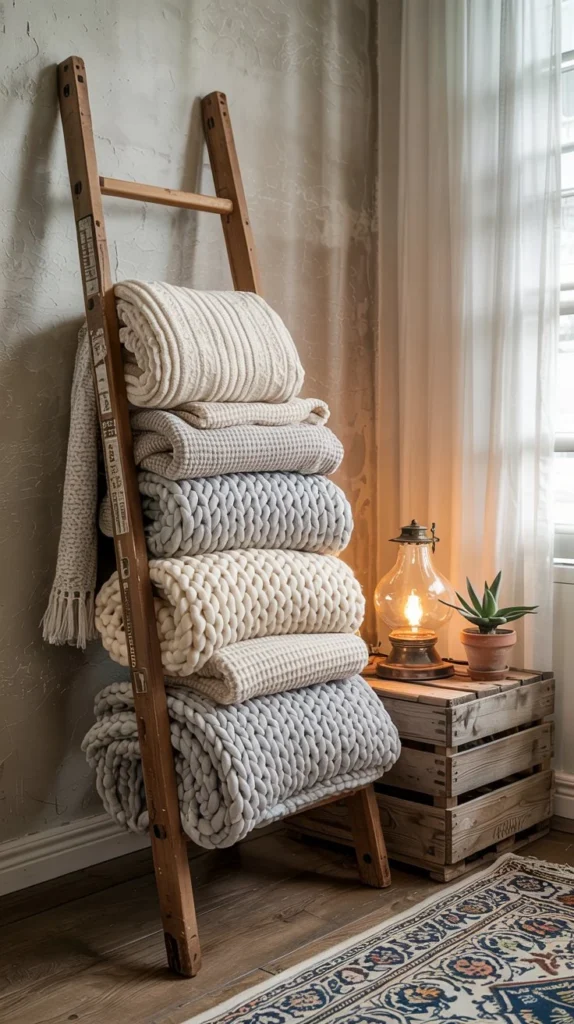 There’s an irreplaceable soul in vintage pieces that new furniture simply can’t replicate. Scour estate sales, thrift stores, and online marketplaces for wooden ladders to use as blanket storage, vintage ceramic lamps, antique wooden bowls, or weathered picture frames.
