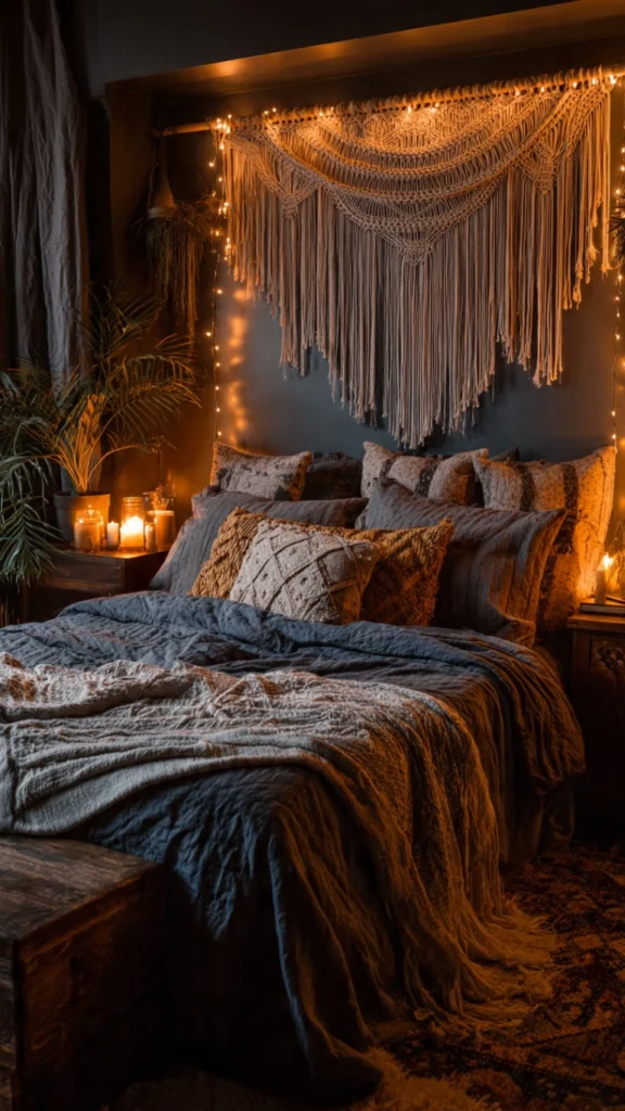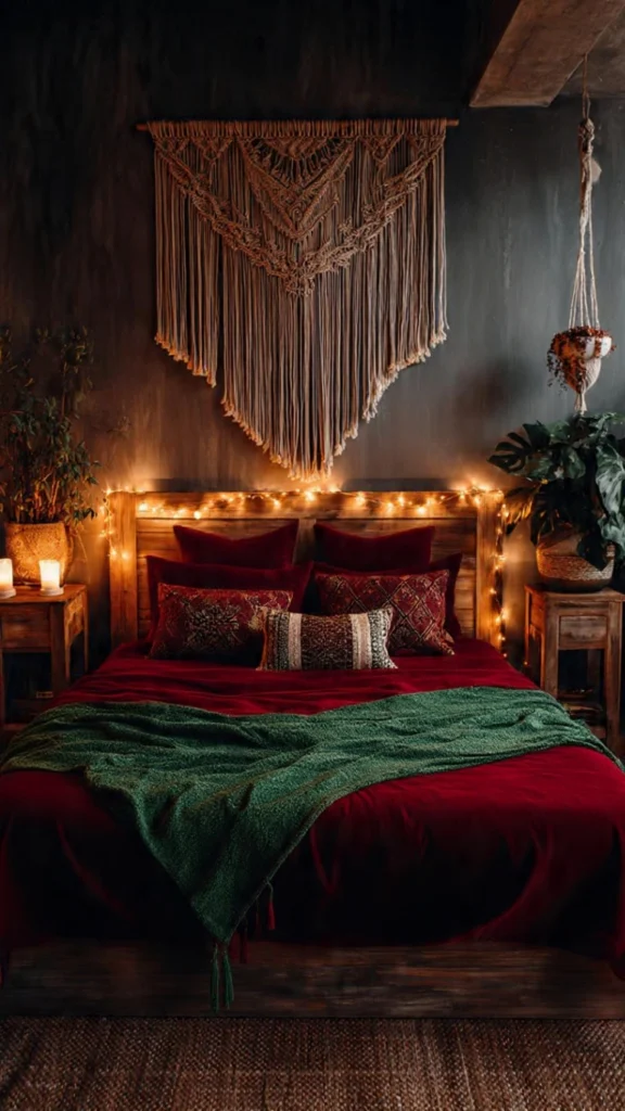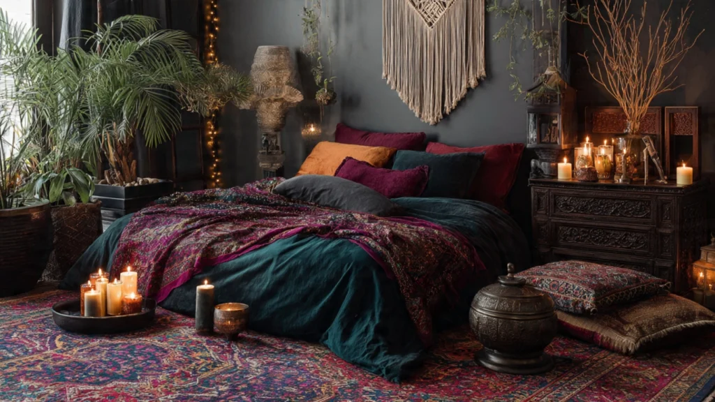 Imagine stepping into a bedroom where deep jewel tones embrace you like twilight, where macramé shadows dance on charcoal walls, and where every texture invites you to sink deeper into comfort. A vintage Persian rug in burgundy and navy anchors your space. Velvet pillows in forest green and burnt orange pile high against your headboard. The air carries hints of sandalwood from the incense burning on your carved wooden nightstand. This isn’t your typical bright-and-airy boho bedroom—this is moody boho at its finest.