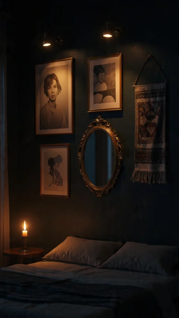 Art in moody boho bedrooms should feel personal, eclectic, and slightly mysterious. Mix vintage portraits, abstract pieces in dark colors, botanical prints, and mirrors with ornate frames. The combination creates gallery walls that feel collected over time rather than purchased in one coordinated set.