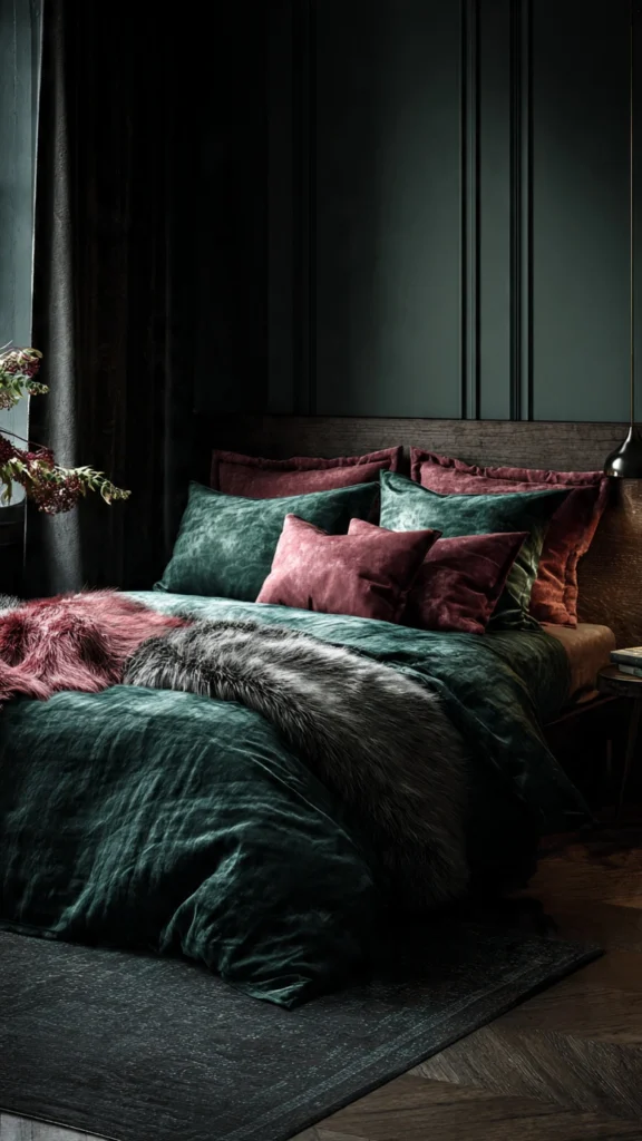 Don’t limit plush textures to velvet. Faux fur throws, chenille blankets, and tufted ottomans all contribute to that sink-into-it comfort that makes moody boho bedrooms so inviting. These tactile elements balance the visual drama of dark walls with physical coziness.