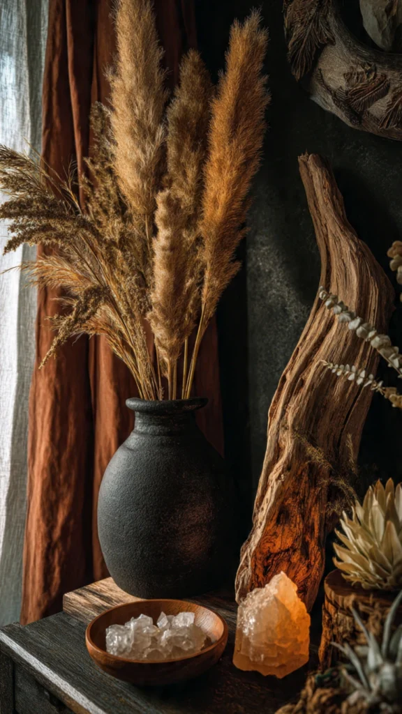 Ground your moody boho bedroom with natural elements that connect your dramatic space back to nature. Dried pampas grass, eucalyptus, palm fronds, and protea in dark ceramic vases add organic shapes without the maintenance of fresh flowers. Their neutral tones and sculptural forms complement rather than compete with your rich color palette.