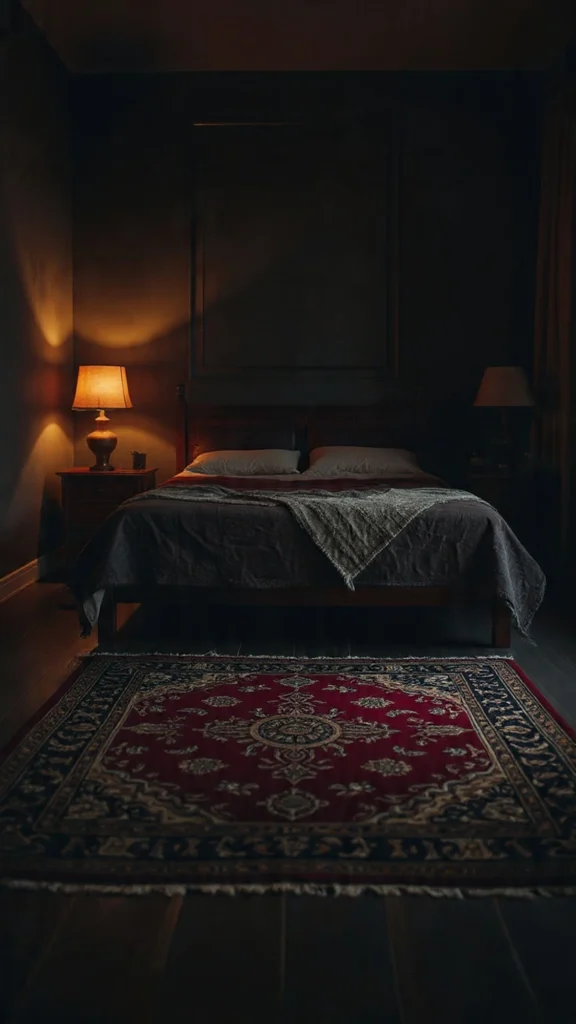 Authentic vintage rugs are the soul of moody boho bedrooms. Persian, Turkish, Moroccan, or tribal rugs in deeper color palettes ground your space while adding instant history and character. These rugs typically feature intricate patterns in burgundy, navy, rust, and gold that perfectly complement the moody aesthetic.