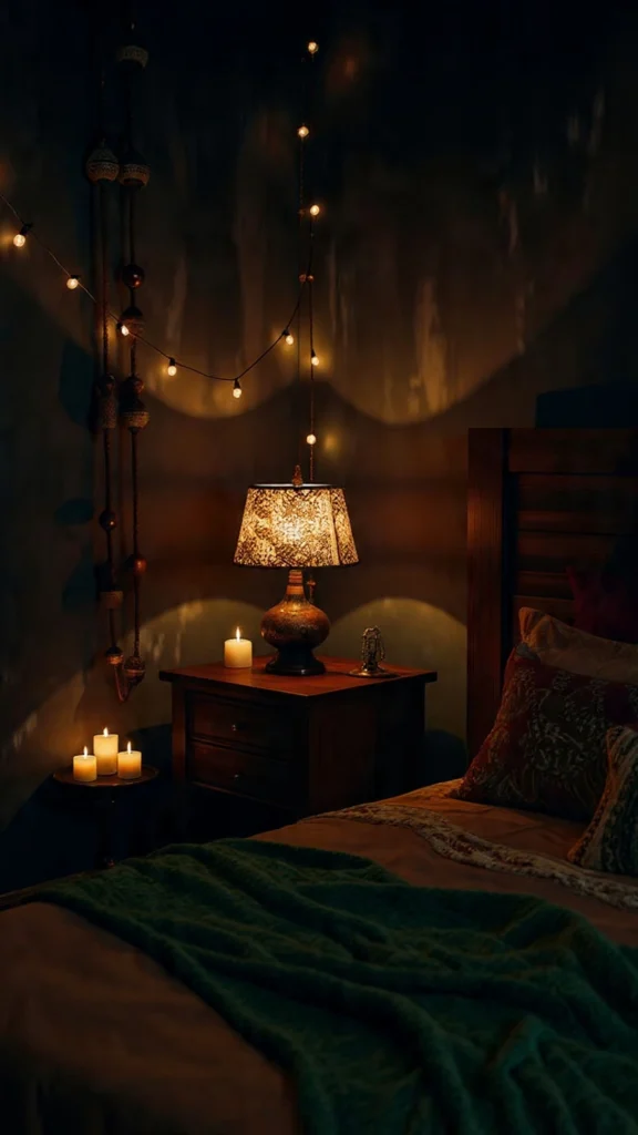 Harsh overhead lighting destroys moody atmosphere faster than anything. Instead, create a constellation of warm light sources at different heights throughout your bedroom. Table lamps with stained glass or beaded shades, string lights with warm bulbs, Moroccan lanterns, and clusters of candles all contribute to that sultry, intimate glow.