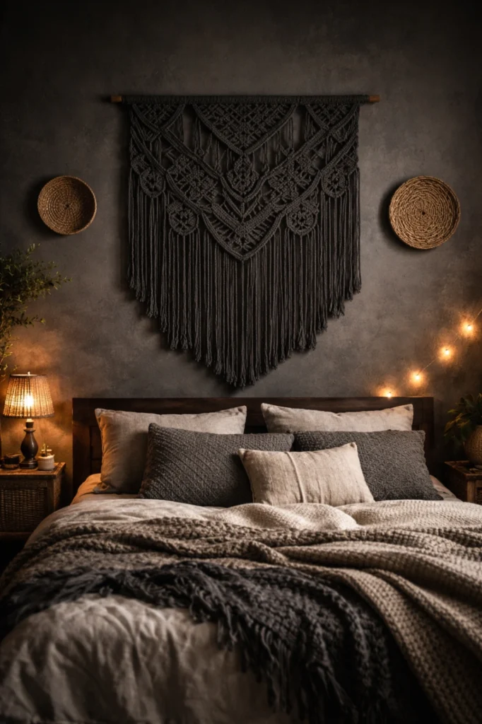 Hang a large macramé piece above your bed as a headboard alternative, or create a gallery wall mixing macramé with other woven pieces, mirrors, and art. The organic, handcrafted quality of fiber art softens the drama of dark walls and adds that essential bohemian touch to your moody space.