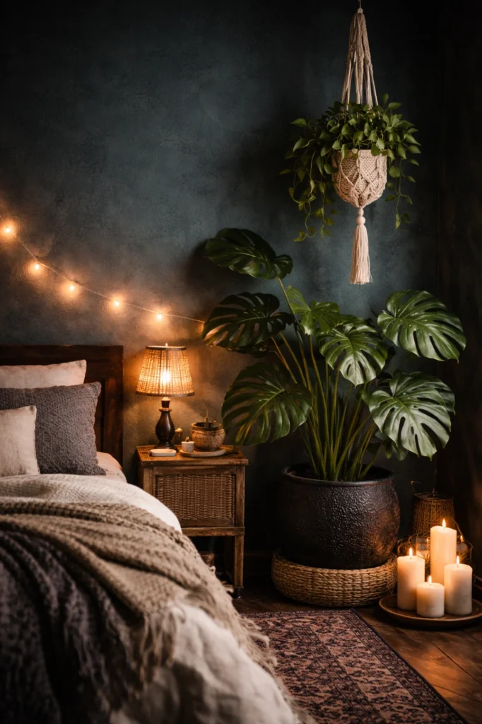 Layer lighting practically too. A reading lamp beside your bed, ambient string lights draped over your headboard, and candles or LED flameless candles on your dresser create functionality alongside atmosphere. In moody boho bedrooms, lighting isn’t just practical—it’s part of the decor itself.