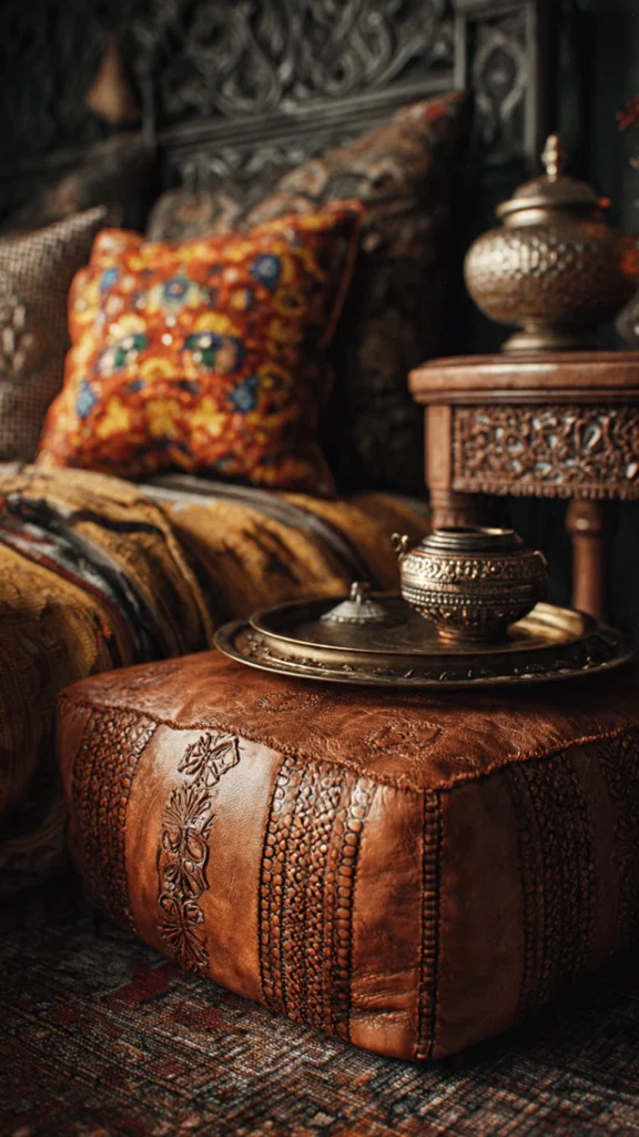 Start with your bed, the focal point of any bedroom. Layer a dark duvet with patterned throw blankets featuring tribal prints, suzani embroidery, or block-printed designs. Add velvet pillows in jewel tones, kilim pillows with geometric patterns, and textured cushions with fringe or tassels. Each layer adds visual interest and tactile comfort.