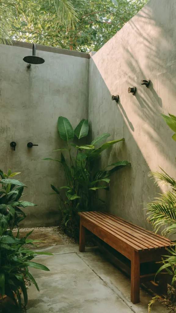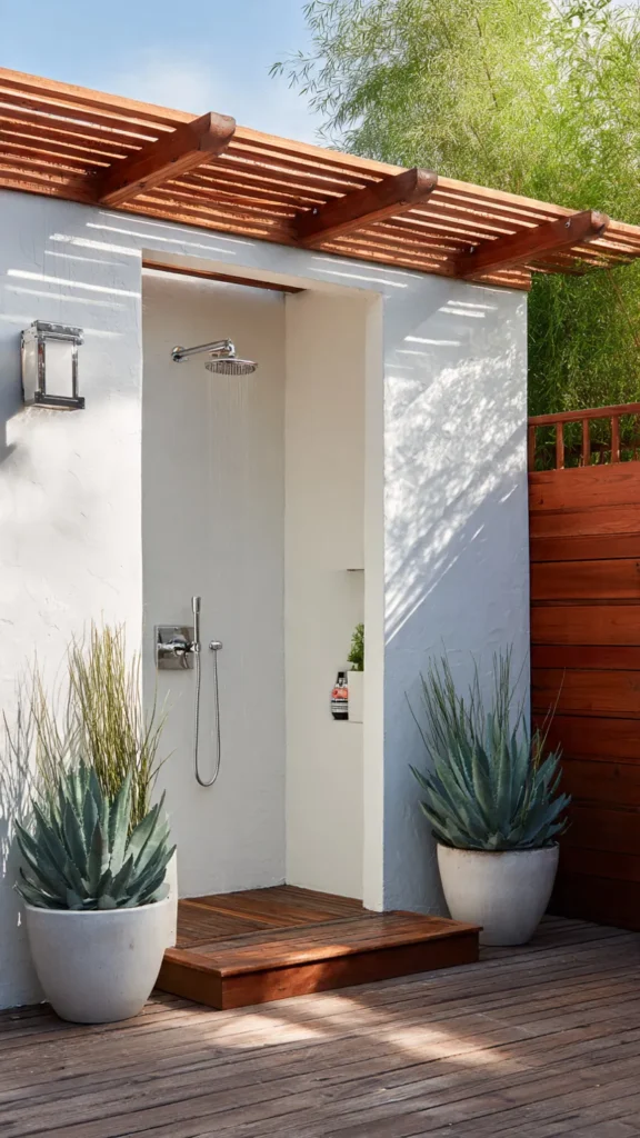 Style the area with weather-resistant outdoor rugs, potted plants, and maybe a small bench or hooks for robes and towels. The proximity to a building structure makes this one of the most practical outdoor shower ideas for year-round use in temperate climates.