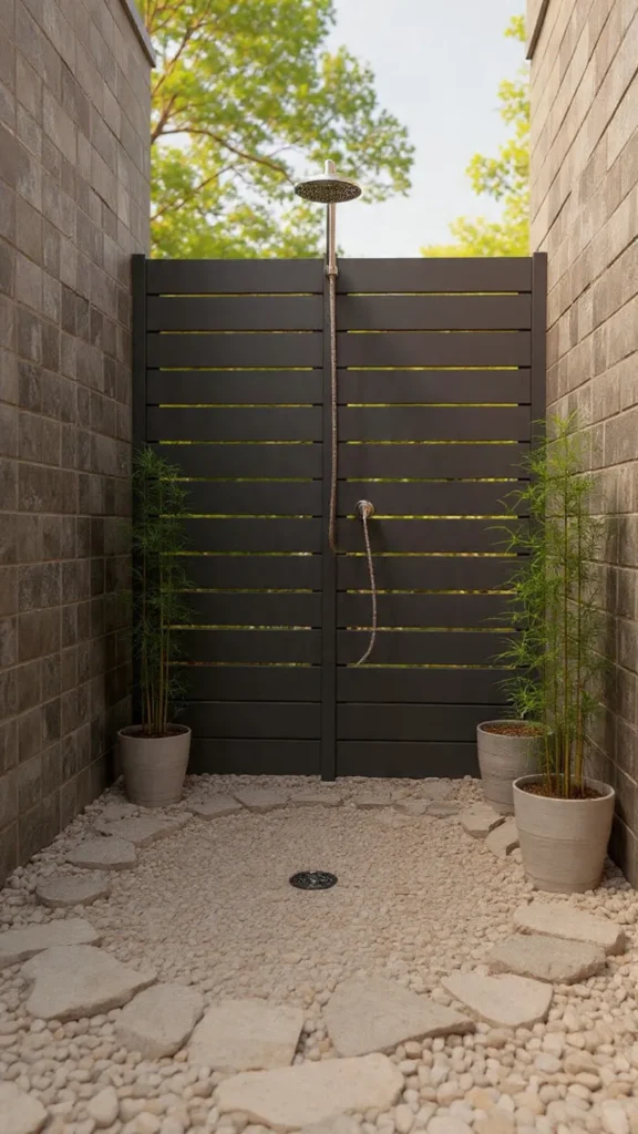 This setup is perfect for renters or those who want portability. You can take the shower fixture with you when you move and restore the gravel area easily. Surround the space with tall ornamental grasses, bamboo, or potted plants to create privacy naturally without permanent structures.