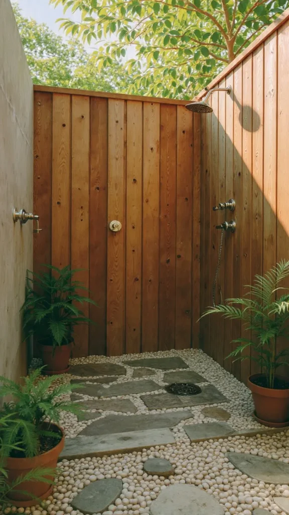Privacy is often the biggest concern when planning outdoor shower ideas. A vertical cedar plank fence creates an enclosure that’s both functional and gorgeous. Cedar naturally resists rot and insects, making it perfect for outdoor applications where it’ll be constantly exposed to moisture.