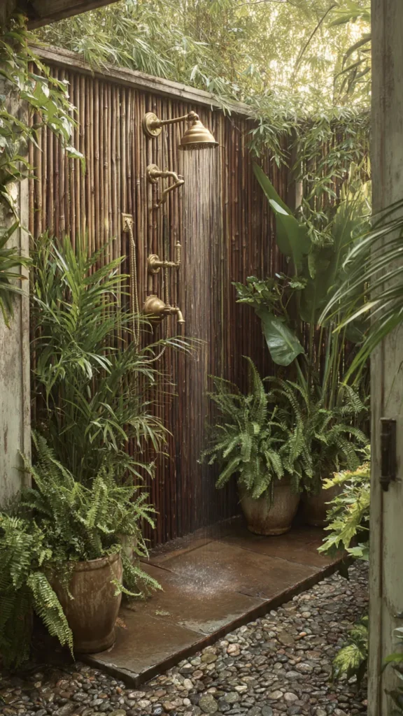 Transform your outdoor shower into a tropical escape by surrounding it with bamboo screens and abundant greenery. Bamboo fencing or rolled bamboo panels create instant privacy while bringing organic texture and warm tones to the space. They’re also surprisingly affordable and easy to install.