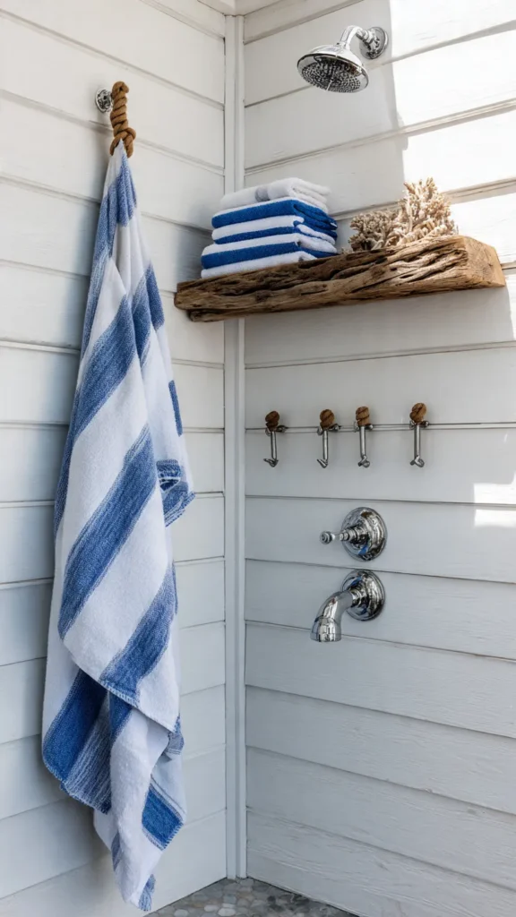 White reflects light beautifully, making even small shower spaces feel open and airy. It’s also incredibly versatile—you can easily change the mood by swapping out accessories. Add striped towels, seashell decorations, or weathered wood elements to complete the coastal aesthetic.