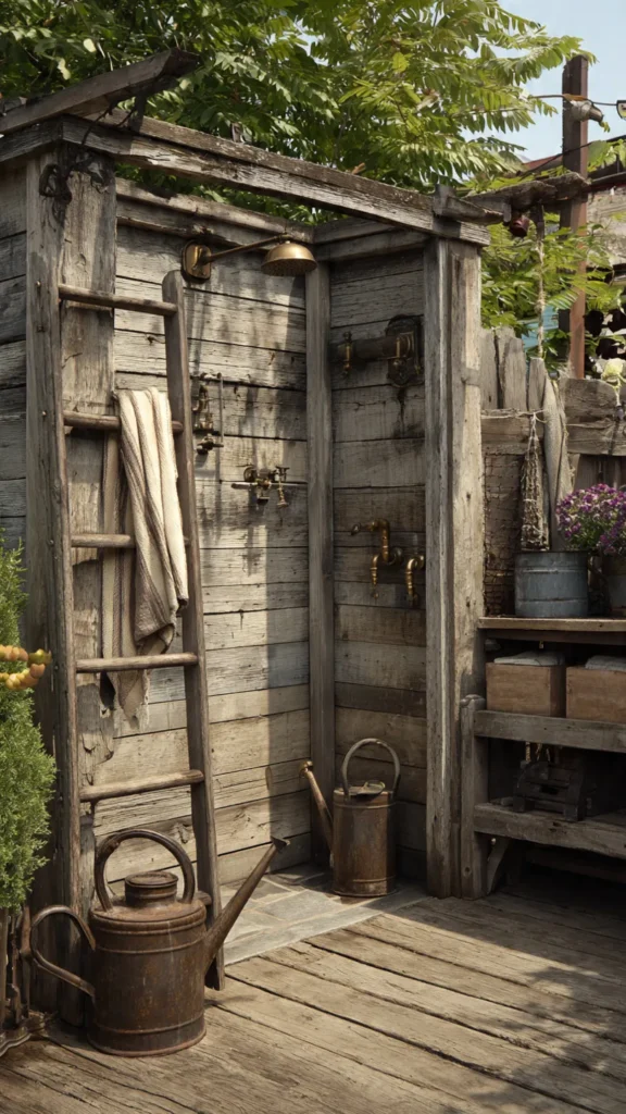 There’s something wonderfully charming about incorporating salvaged and vintage elements into outdoor spaces. Use reclaimed wood for the enclosure, vintage plumbing fixtures from architectural salvage shops, and weathered metal buckets or crates for storage.