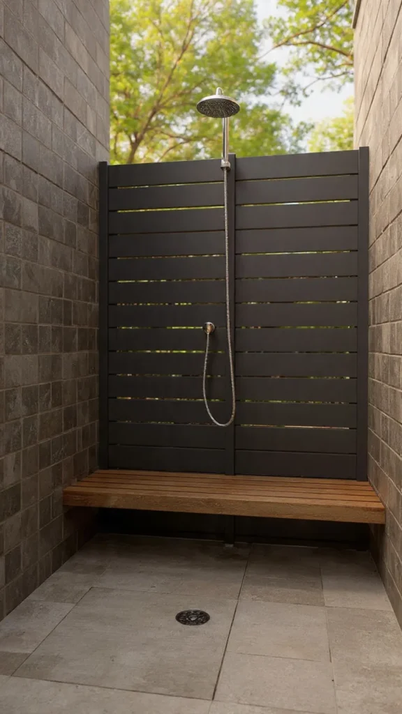 The horizontal orientation creates a calming, grounding effect and makes spaces feel wider. Add built-in benches at varying heights or incorporate planters directly into the screen design for a seamless, architectural look. These outdoor shower ideas feel custom and high-end without requiring complex construction.