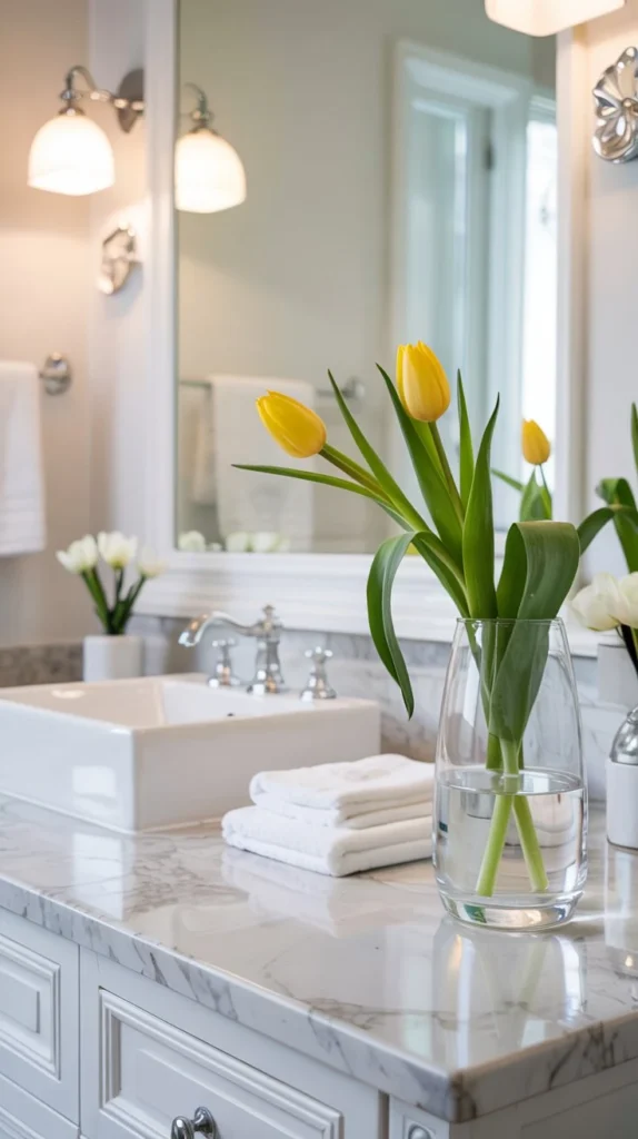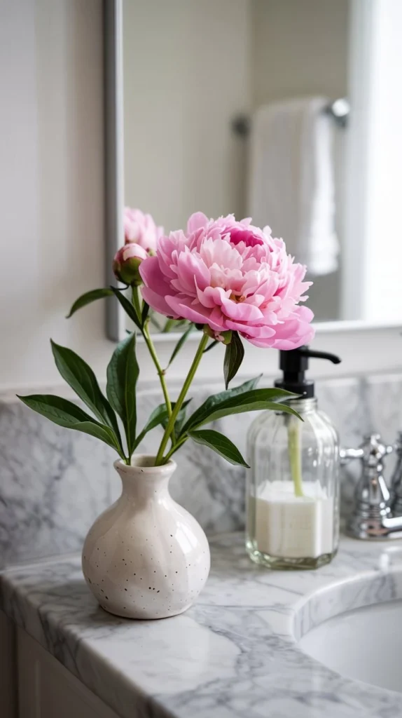 A single tulip, ranunculus, or peony stem tucked into a small ceramic bud vase on your bathroom counter instantly signals that spring has arrived. The key is keeping it minimal — one or two blooms in soft blush, ivory, or butter yellow feel far more curated than a full bouquet crowding your sink space.