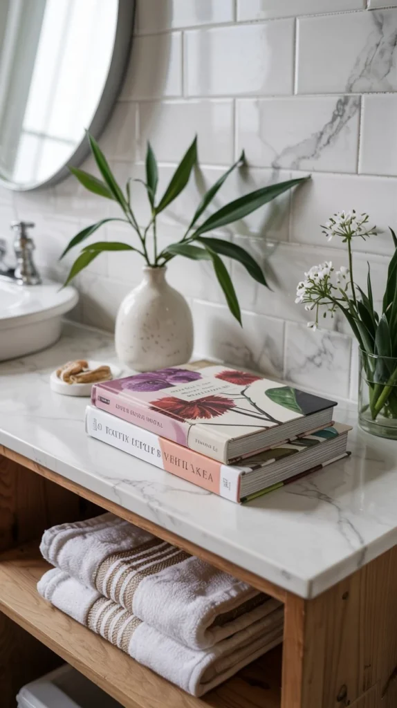 A small stack of beautiful coffee table books or a rolled issue of a design magazine adds warmth and personality to a bathroom counter or shelf. Look for books with dreamy cover art — nature photography, botanical illustration, or pastel-toned lifestyle titles work beautifully.