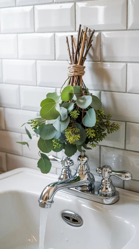 Hanging a fresh eucalyptus bundle from your faucet or showerhead is one of the most viral spring bathroom counter decor ideas for good reason — it’s stunning, easy, and turns your morning shower into a spa experience. The steam releases the eucalyptus oils, filling the entire bathroom with a clean, herbal scent.