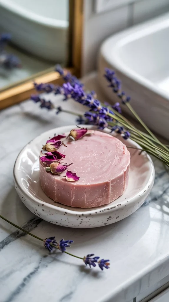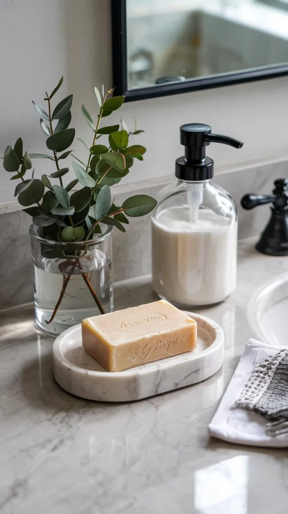 A thoughtfully chosen artisan bar soap sitting in a stone or ceramic dish is one of those spring bathroom counter decor ideas that’s so simple it feels almost too easy. Look for bars with botanical inclusions — dried flower petals, herbs, or oat textures — in spring-appropriate scents like rose, lemon verbena, or fresh lavender.