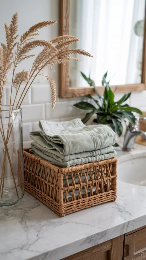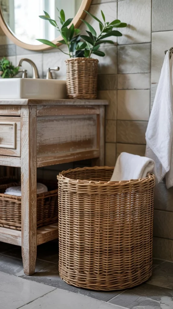 While the wastebasket technically lives on the floor, a wicker or rattan design ties directly into the natural, earthy aesthetic of spring bathroom counter decor ideas. The visual continuity of natural textures from the floor up through the counter creates a layered, intentional look that feels cohesive rather than random.