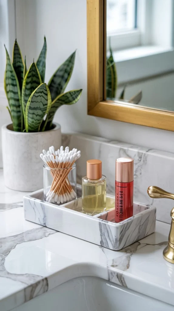 A small hand mirror or mirrored tray on your bathroom counter reflects light beautifully and adds a touch of glamour without overwhelming the space. Mirrored trays in particular are incredible at making a counter look intentionally styled — they’re the kind of thing that reads as “expensive” even when the items on them are completely ordinary.