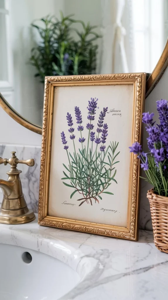 A small framed botanical print leaning against the mirror or hung on the wall beside it transforms a bathroom counter area from purely functional to genuinely designed. Spring 2026 leans into vintage botanical illustration — think aged paper-style prints of florals, ferns, and herbs in simple gold or white frames.