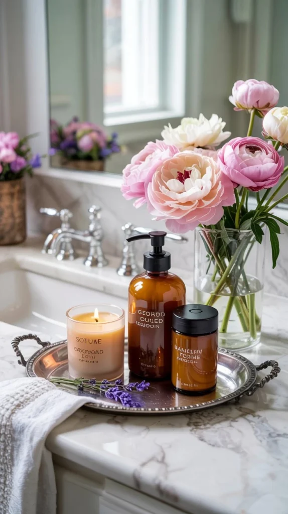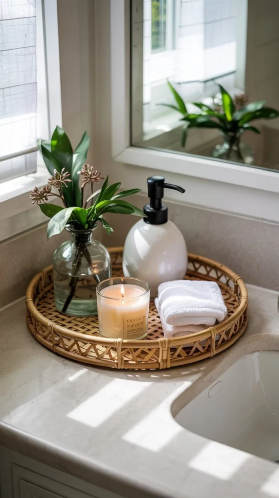 One of the most underrated spring bathroom counter decor ideas is simply corralling your everyday items — soap dispenser, lotion, a candle — onto a single decorative tray. A round bamboo tray or rectangular rattan piece immediately adds warmth and grounds the entire vignette.