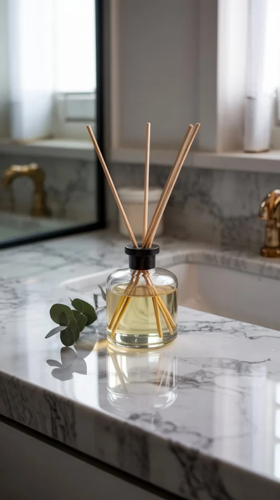 A reed diffuser or small electric diffuser on your bathroom counter does double duty — it looks beautiful and fills the room with a fragrance that feels unmistakably spring. Think citrus blossom, fresh linen, white tea, or green bamboo. Light and clean is the vibe.