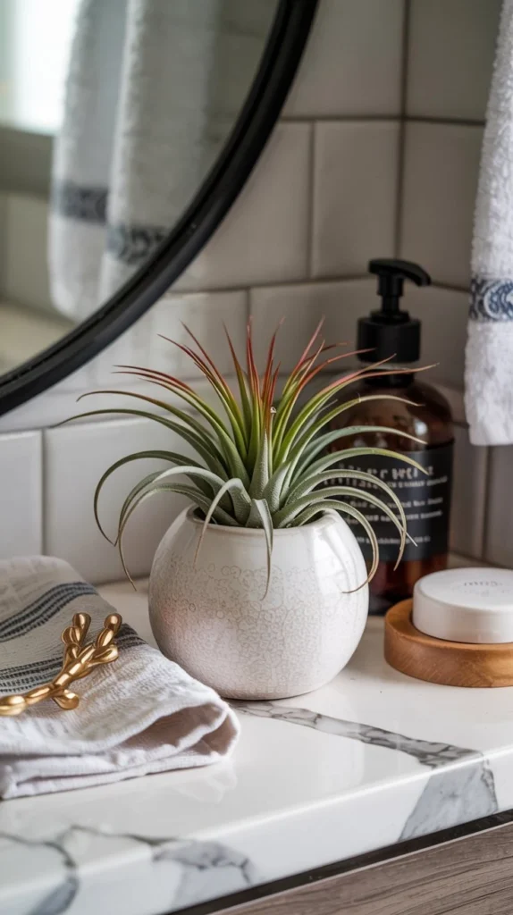 Live plants make any space feel instantly fresher, and the bathroom is actually a surprisingly good environment for certain varieties. A small succulent, air plant (tillandsia), or baby photos in a terracotta or white pot is one of the most timeless spring bathroom counter decor ideas that works year-round.