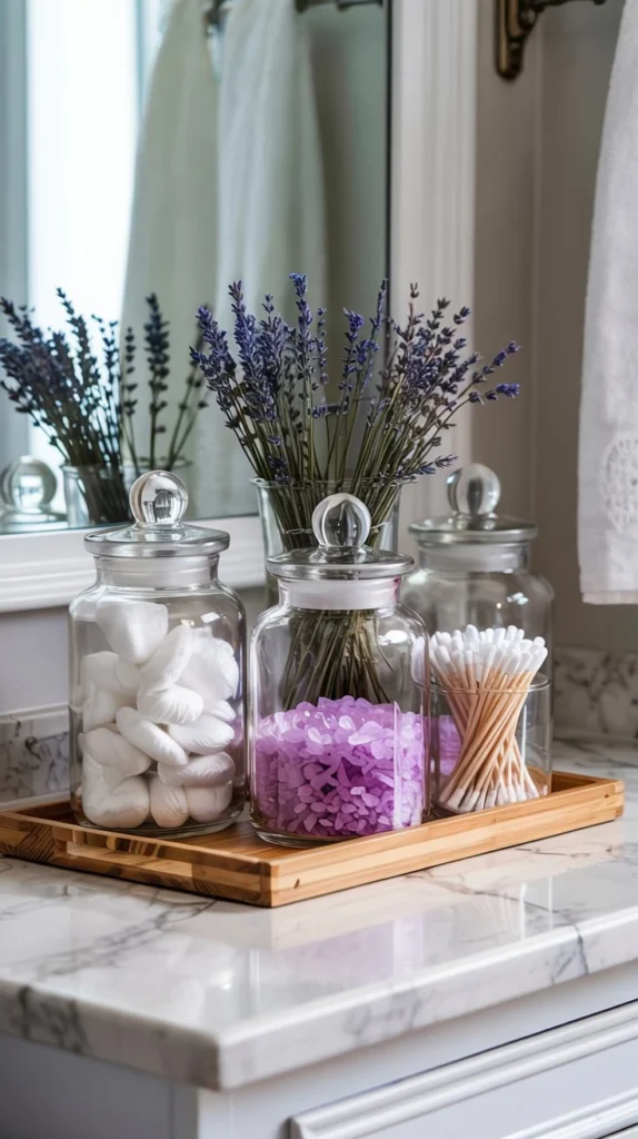 Clear glass apothecary jars are a classic bathroom counter staple, and in spring 2026, they’re being styled with intention. Fill one with fluffy white cotton balls, pastel bath pearls, or lavender-scented Epsom salts for a display that’s both pretty and practical.