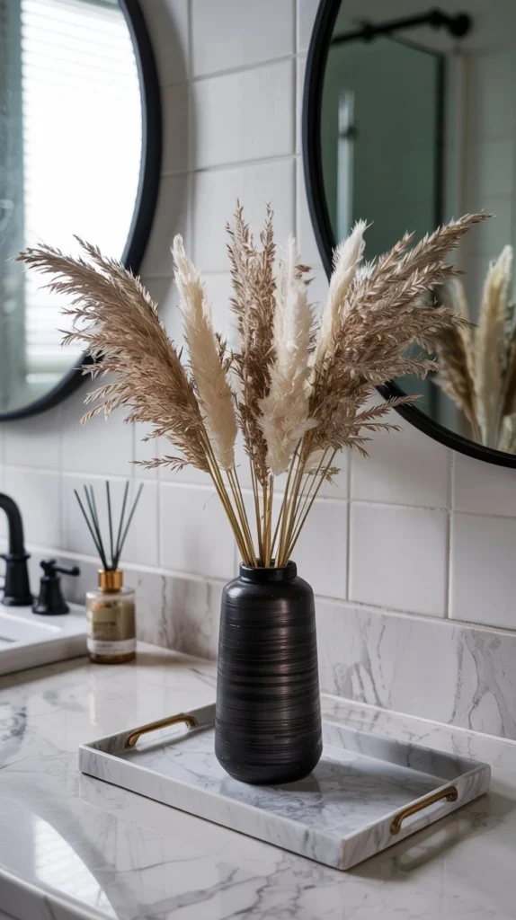 A small bundle of dried pampas grass, dried lavender, or preserved cotton stems tucked into a slender vase adds height, texture, and movement to a bathroom counter without wilting by Thursday. This look is particularly gorgeous in apartments and rentals where you want something low-effort but high-style.