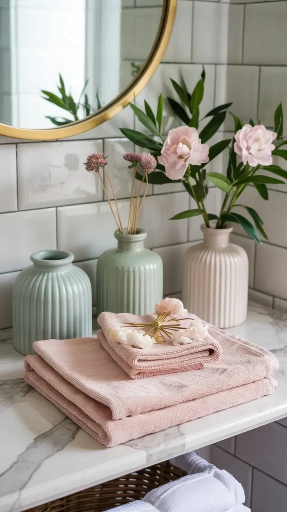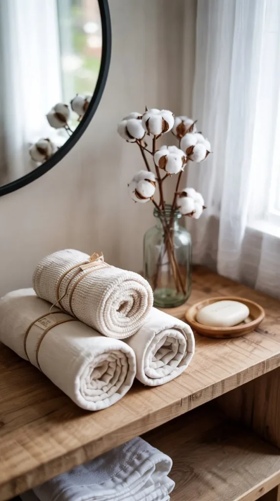You don’t need matching sets to make this work. Mixing two or three tonal shades actually creates more visual warmth than a perfectly matchy arrangement. Add a small tray beneath the towels to ground the display.