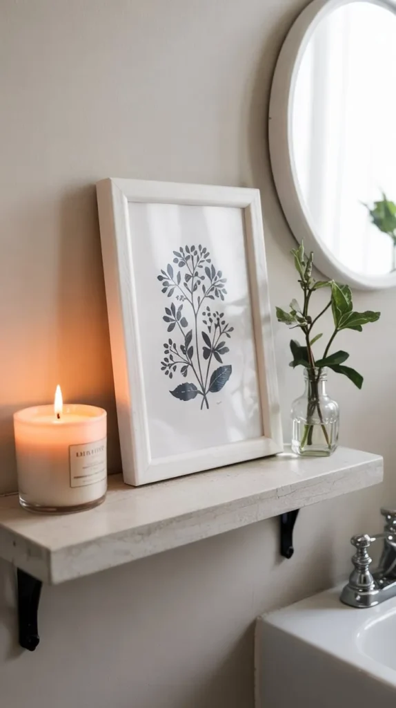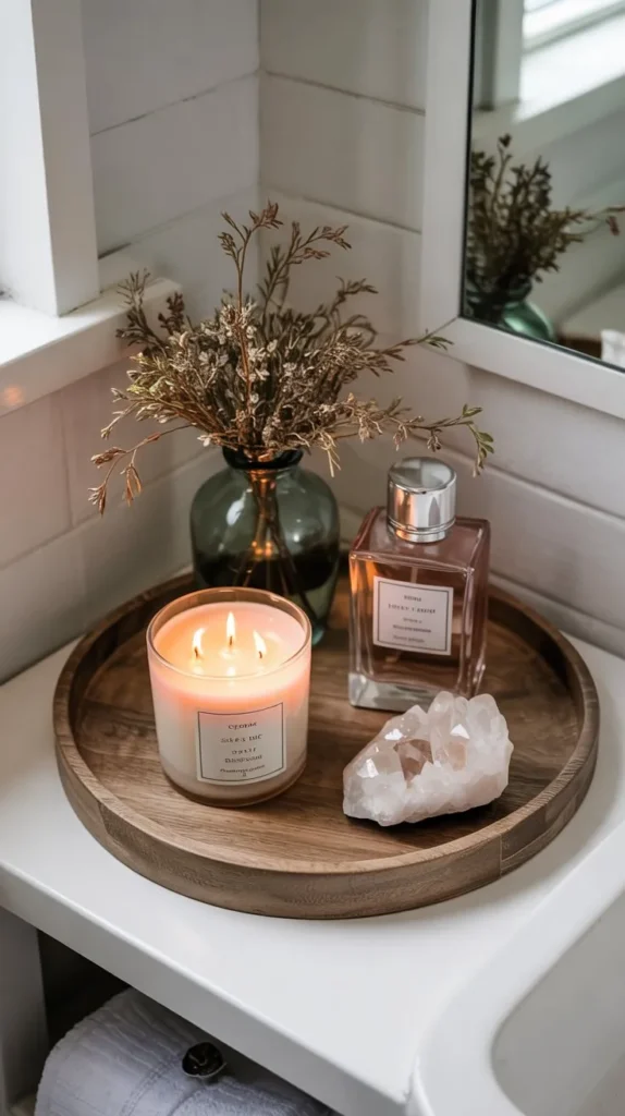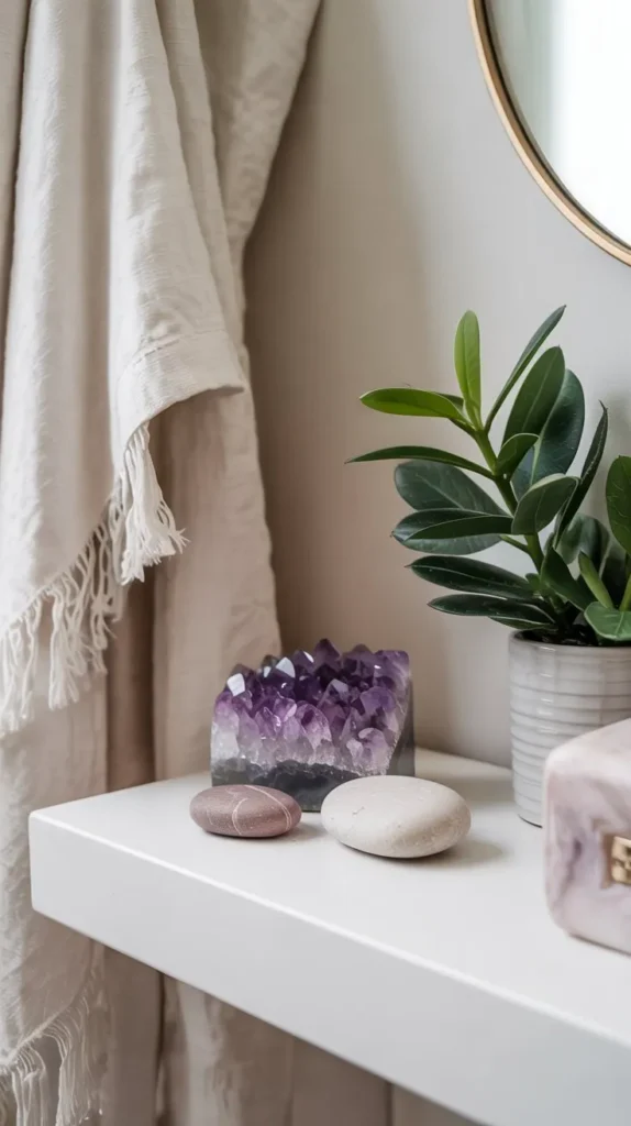 This is also one of the most budget-friendly bathroom shelf decorating ideas out there. A small crystal doesn’t need to be anything special — it just needs to catch light, carry color, and feel like it belongs.