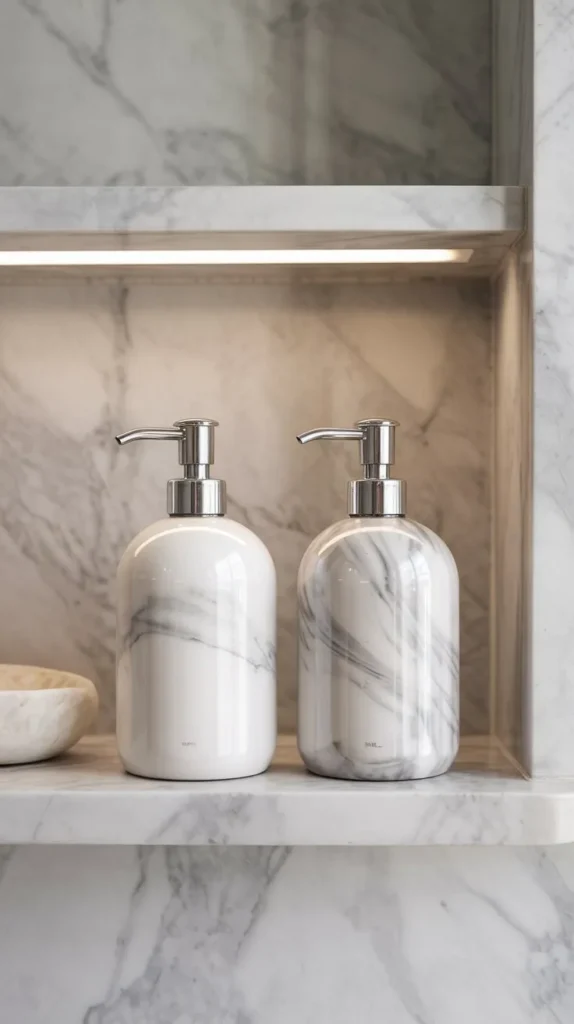 Decanting your hand soap and lotion into a matching pump set is one of the simplest ways to elevate your bathroom shelf immediately. It removes the visual noise of different branded bottles and replaces it with something cohesive and calm.