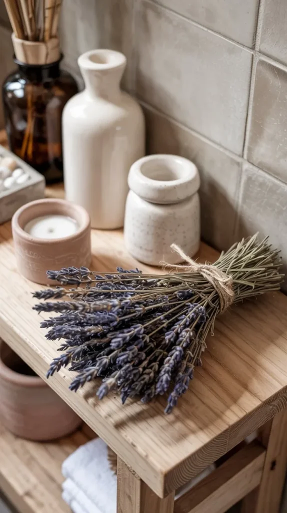 Dried botanicals are having a major moment in home decor, and bathroom shelves are one of the best places to use them. A bundle of dried lavender, a few stems of pampas grass, or a small dried floral arrangement brings texture and color without wilting in the humidity.
