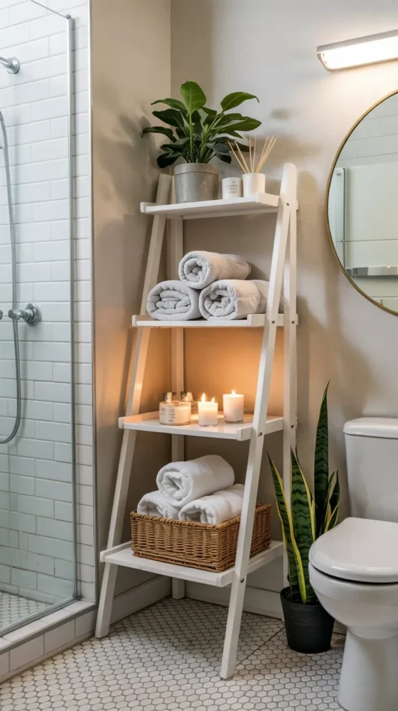 If your bathroom walls are bare and you’re working with limited counter space, a slim freestanding ladder shelf is a game-changer. It creates multiple levels of styling surface without requiring any installation, making it perfect for rentals and apartments.