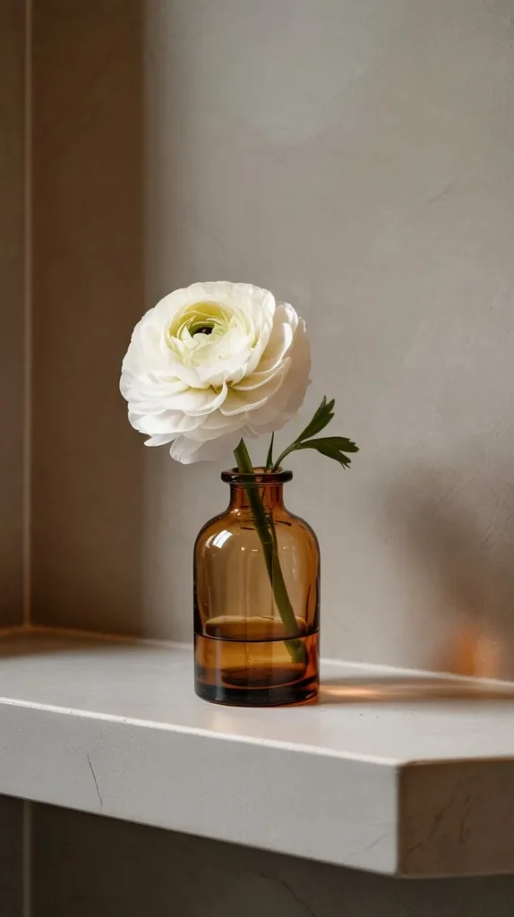 The trick is in the vessel. A colored glass bottle, a ceramic bud vase, or even an empty perfume bottle repurposed as a vase all bring personality without clutter. Switch out the stem as it fades and you’ve got a living, ever-changing shelf moment.