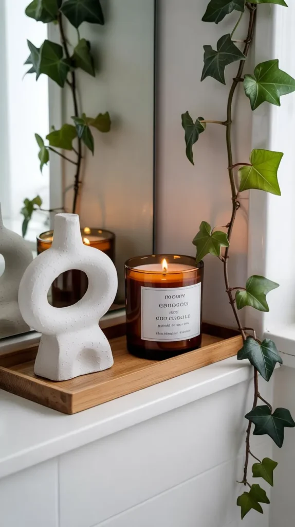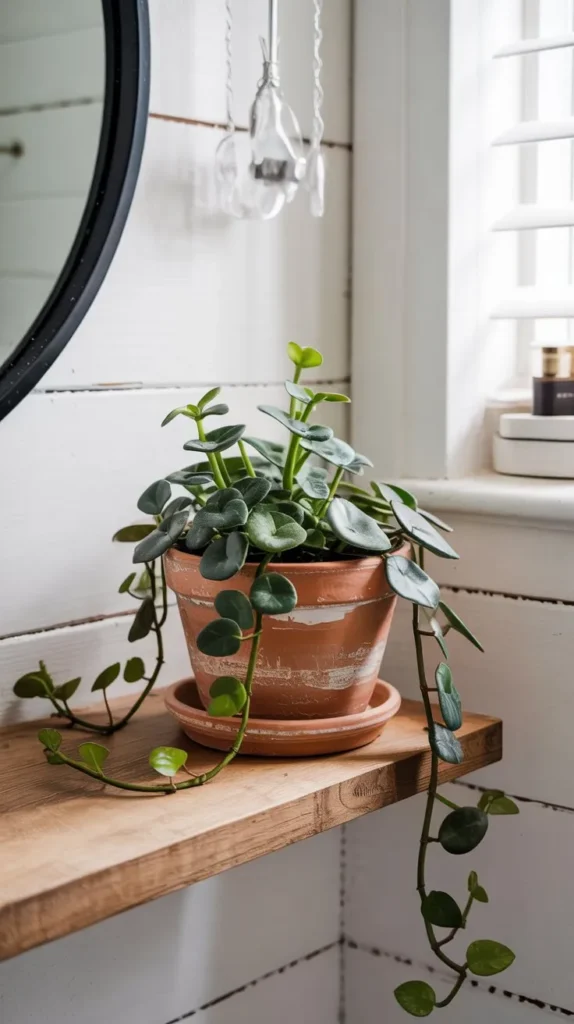 A trailing plant is shelf decor that does the heavy lifting on its own. Pothos, heartleaf philodendron, and string of pearls are all low-maintenance options that thrive in humid bathroom environments and grow beautifully over shelf edges.