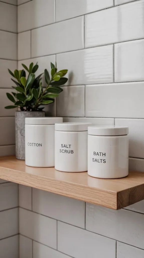 Matching ceramic canisters are one of those spring bathroom shelf decor ideas that look like they came straight from a high-end boutique hotel. Use them to store cotton rounds, q-tips, bath salts, or any small item that usually ends up scattered across your counter.