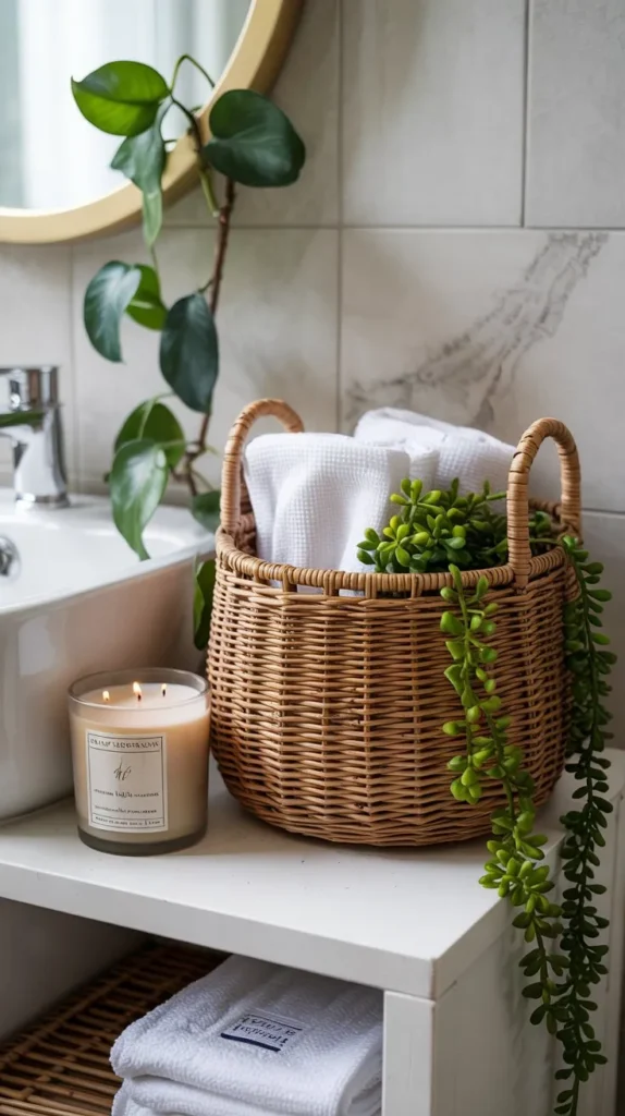 Practical tip: Look for baskets with lids if you want to hide contents completely. Lidless baskets work best when what’s inside is also visually appealing — like rolled washcloths or wrapped soap bars.