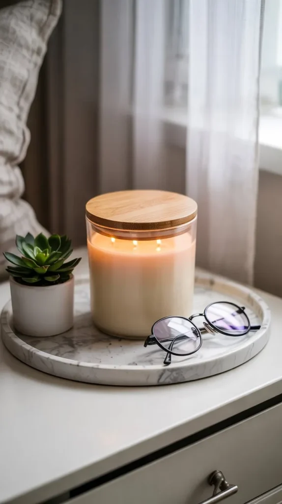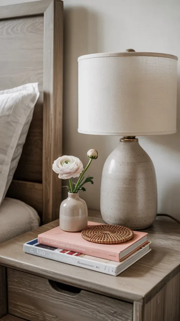 The key to a nightstand vignette that looks intentional rather than cluttered is restraint. Edit down to five objects maximum and vary the height of each element. If your lamp is tall, keep everything else low. If you don’t have a lamp, a small rechargeable table light from IKEA or Amazon can add that warm glow without any wiring.