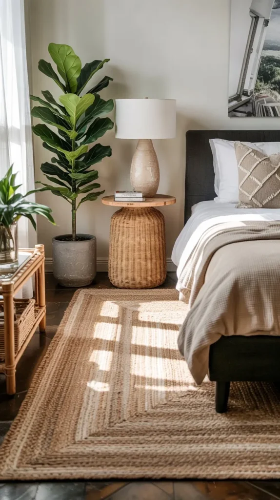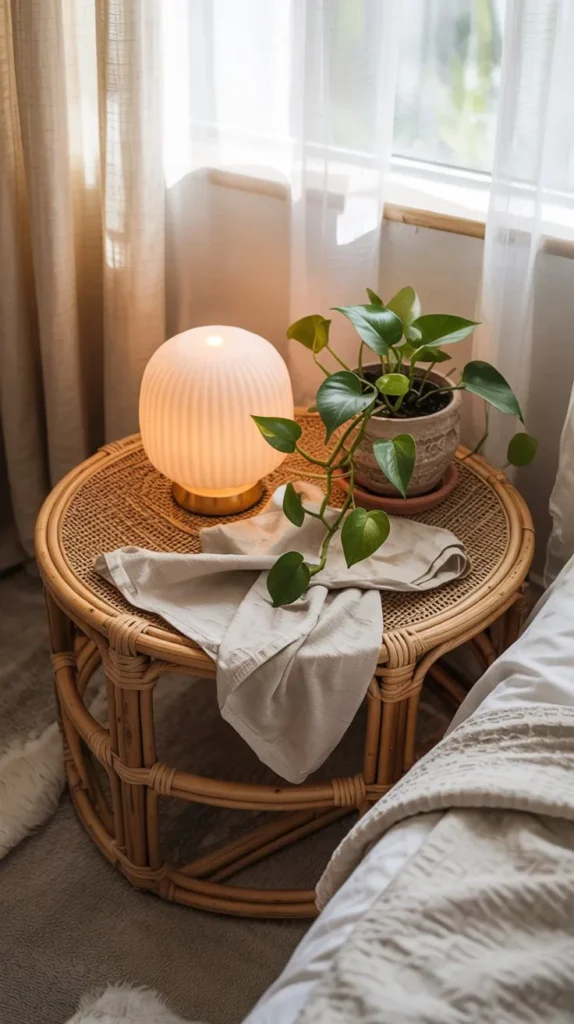 For renters or those working with a tighter budget, rattan accent pieces are widely available at Target, World Market, IKEA, and thrift stores. Even a small woven rattan decorative basket used to corral extra blankets at the foot of the bed adds warmth and texture to an otherwise flat room.