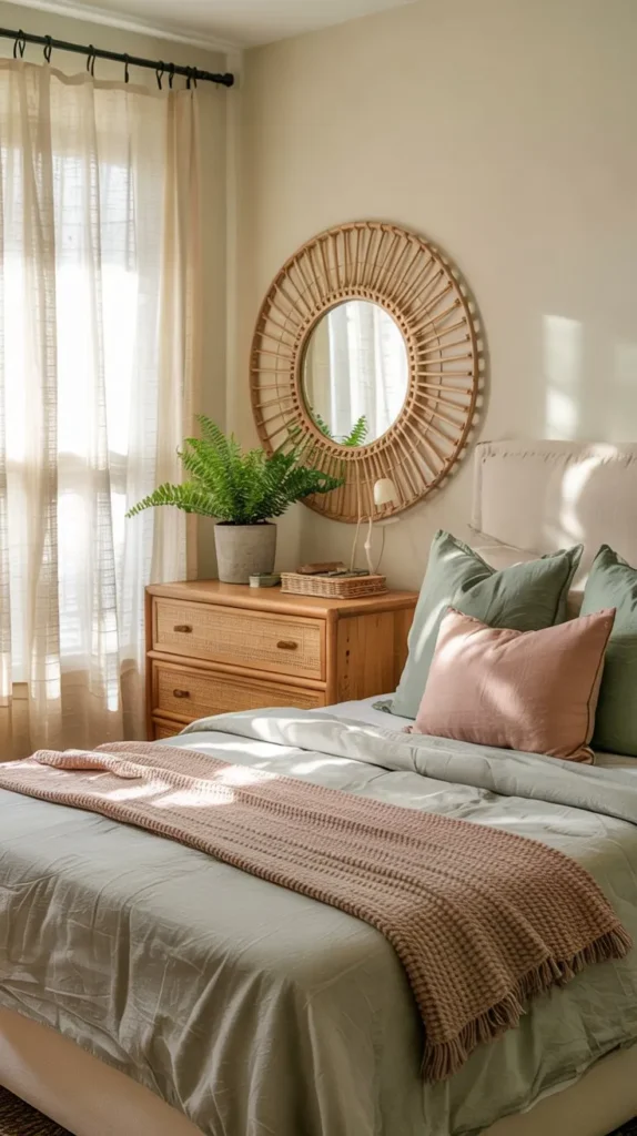 Natural materials are at the core of the spring aesthetic bedroom trend, and rattan remains one of the easiest and most versatile textures to work into a bedroom. A rattan pendant light, woven headboard, side table, or even a simple rattan tray can instantly warm up a space and give it that curated, bohemian-meets-coastal cottage energy.