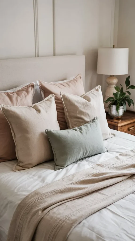 Throw pillows are the single fastest way to completely change the mood of a bedroom — and for spring, it’s all about texture over pattern. Think boucle, linen, waffle weave, and velvet in muted, nature-adjacent tones. Mix sizes deliberately: a pair of king or queen shams, a pair of standard pillows in a complementary color, and one or two lumbar pillows in the front for that layered, editorial look.