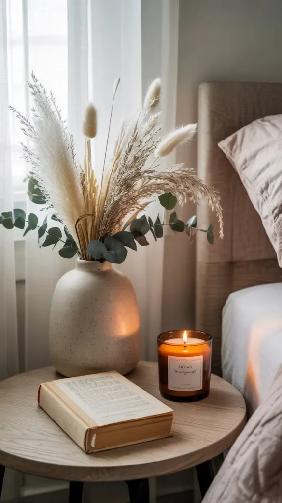 If fresh flowers feel high-maintenance, dried botanicals are having a serious design moment. Pampas grass, dried lavender bundles, and preserved eucalyptus last for months, require zero water, and look effortlessly chic styled in a corner of your dresser or on your nightstand. Pair them with a small candle and a stack of design books for an instantly styled vignette.