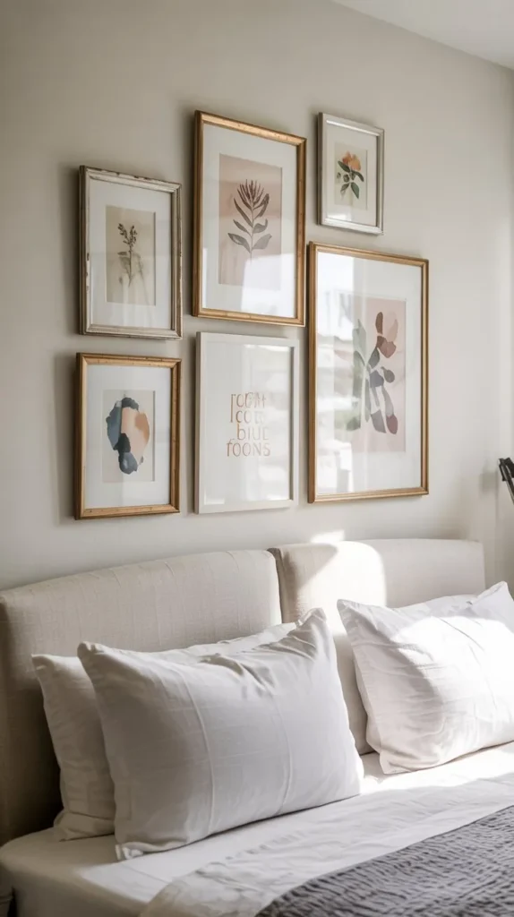 A gallery wall doesn’t have to be permanent or expensive to look stunning. For a spring bedroom refresh, try a small curated cluster of three to five frames above your headboard or on a blank wall beside your bed. Mix frame finishes — a brass frame next to a raw wood frame next to a simple white frame — for an eclectic, collected-over-time quality.