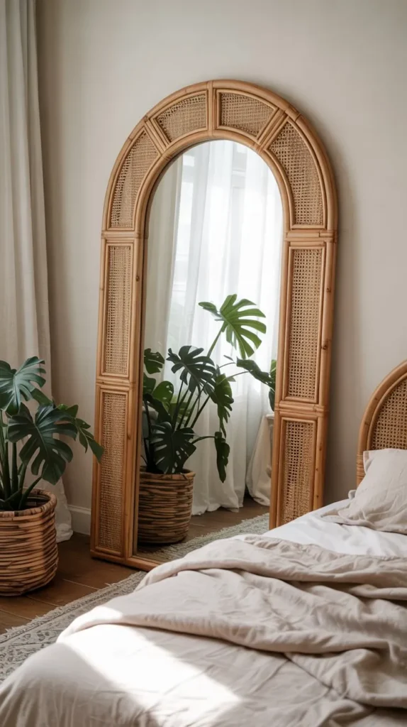Lean a large floor mirror against the wall beside your bed or dresser for a casually luxurious look that’s become a staple of modern spring bedroom aesthetics. If floor space is limited, a smaller arched mirror hung above a dresser or on a blank wall adds architectural interest and reflects light beautifully throughout the day.